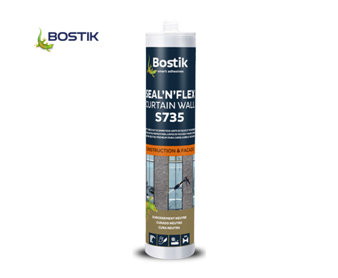 "Bostik S735 SEAL’N’FLEX CURTAIN WALL é um silicone neutro de elevada qualidade para selagem de juntas em muros cortina, fachadas, caixilharia, envidraçados e juntas de dilatação. Bostik S735 SEAL’N’FLEX CURTAIN WALL cumpre as especificações BREEAM relativamente à qualidade do ar interior, no que diz respeito às emissões dos compostos orgânicos voláteis (COV)."