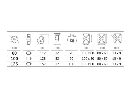 Roda (2522) Cores disponíveis: Preto (Borracha) Medidas disponíveis: 80 Ø - 70 Kg 100 Ø - 90 Kg Preços apenas sob consulta Categoria Rodas